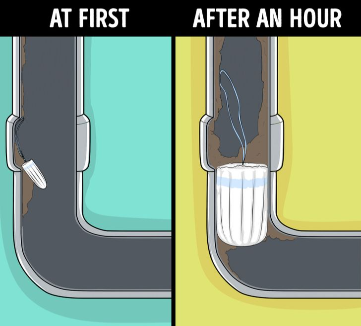 Women’s hygiene products such as tampons and pads are designed to absorb moisture. This makes them dangerous to flush. In water, they expand and can cause severe blockages.
