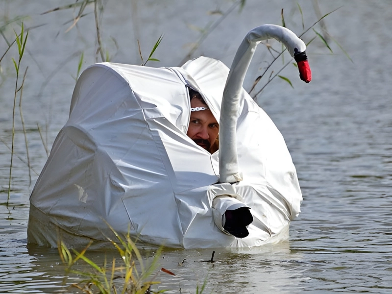 Let us hope the swan does not fall in love. Dressed in white and drifting serenely, the subject could pass for one of the elegant birds. This whimsical tableau blurs human and animal, inviting a gentle, poetic smile.