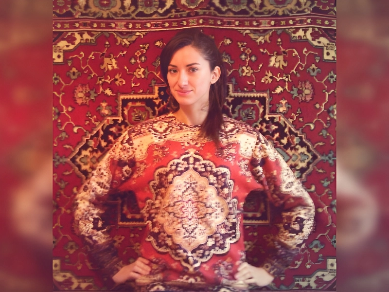 She found her perfect rug. Her outfit matches the carpet so well she nearly vanishes. A playful reminder that the ideal match might be underfoot.