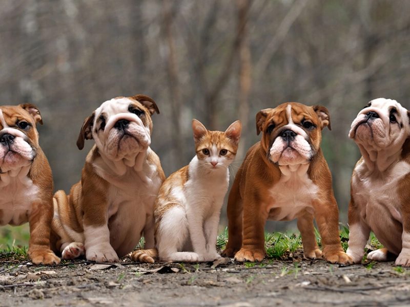 Four dogs and one worthy spy. The task is to spot the hidden figure among the pups, made tricky by clever blending. A simple gathering becomes a joyful test of observation.