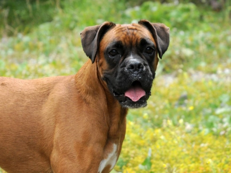 Boxers are a short-haired, medium-to-large German breed. Their sturdy build belies a calm, trainable, and intelligent nature. Energetic and devoted, they are good with kids and other dogs. Allboxerinfo.com notes they are strong hunters with powerful jaws. Their broad muzzle and open nostrils let them breathe while holding prey. Without training, they may attack small animals.