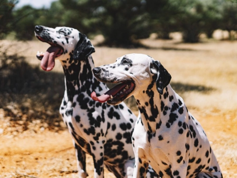Dalmatians are medium-sized dogs with white coats and black or brown spots. Often seen with fire trucks, they require thorough training. Cheerful and friendly, they can become dominant without control. Protective and affectionate with their people, they may seem threatening to strangers at first. With proper care, they are guardians, companions, and playmates in one.