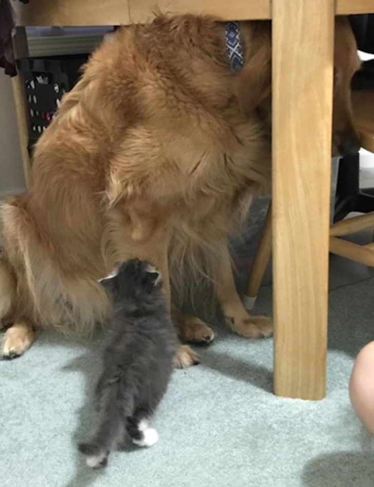 Despite the huge size gap, the tiny kitten has become the boss of the house, to everyone’s amusement. This funny role reversal shows that courage and attitude often matter more than size, and animals never stop surprising us with their bold personalities.