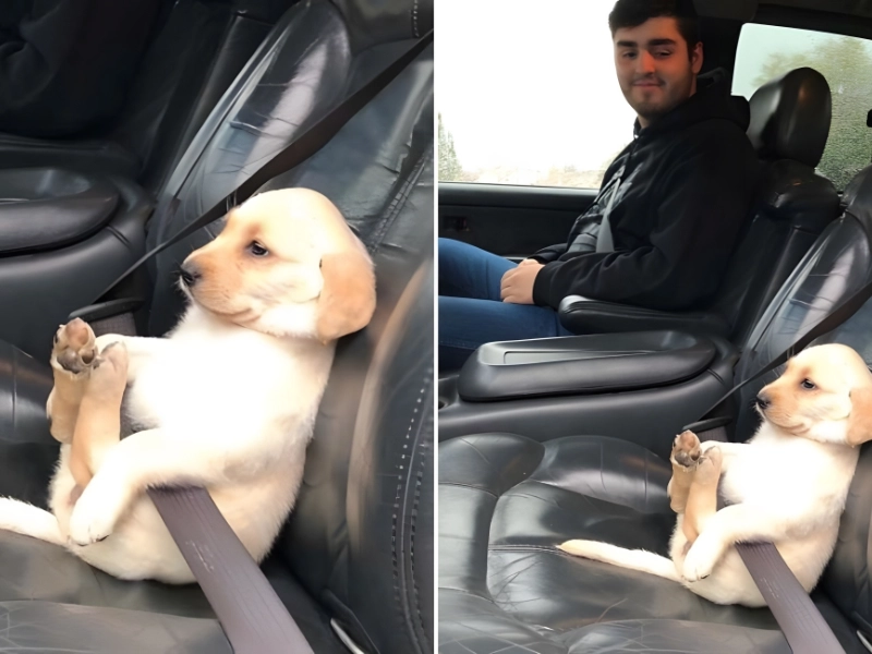 We love when humans and pets take safety seriously. This puppy sits calmly in the car, buckled up and ready for the trip.