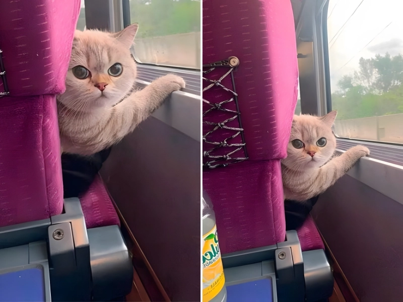 Instead of an irritated passenger, she met the stern glare of a cat ready to set her straight. Perhaps a treat and a gentle pet could smooth things over.
