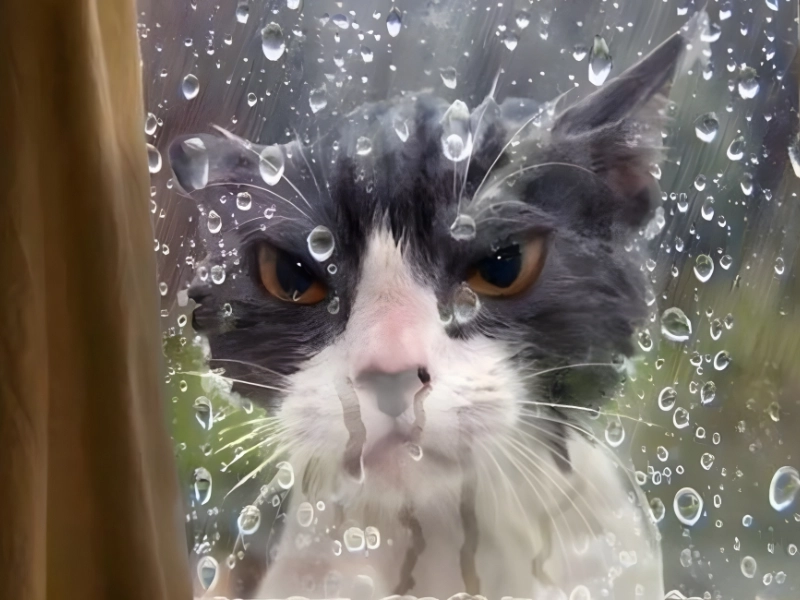 This cat looks very displeased after getting drenched, which is understandable. Judging by his face, he may be ready for a serious chat with his owners once inside.