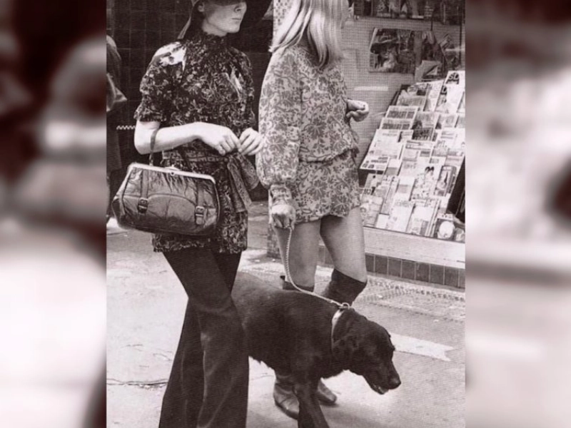An elegant woman cradles a puppy, radiating grace and warmth—qualities that made the era’s icons so beloved.