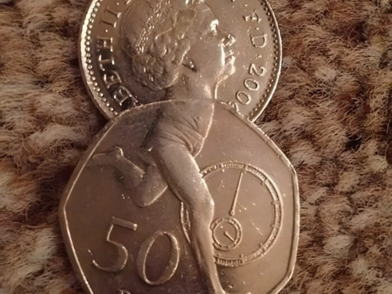 We’re not experts on British coins, so we can’t say exactly what the 50-pence piece shows. But whatever it is, it aligns perfectly with the late Queen Elizabeth’s face. Was this intentional? The odds of such a match by chance seem tiny. It must have been precise positioning.