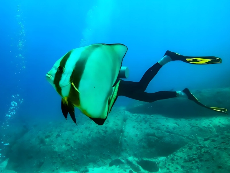 A fellow diver hides behind the batfish, completing the playful illusion. For a new diver, it’s the kind of lucky capture that sparks a lifelong love of the ocean.