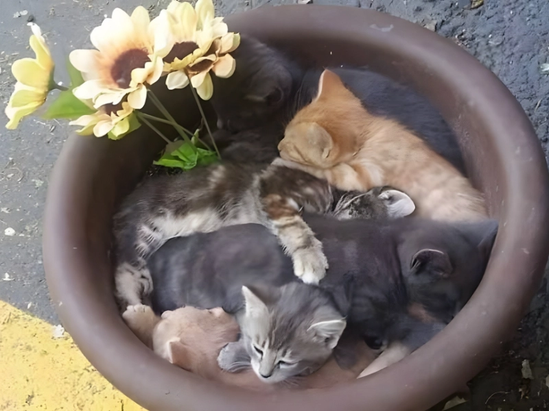 Every cat owner knows the moment: a sudden yawn from the least expected place. Here, a pot brims with curled-up cats, turning a simple container into the coziest suite in town.