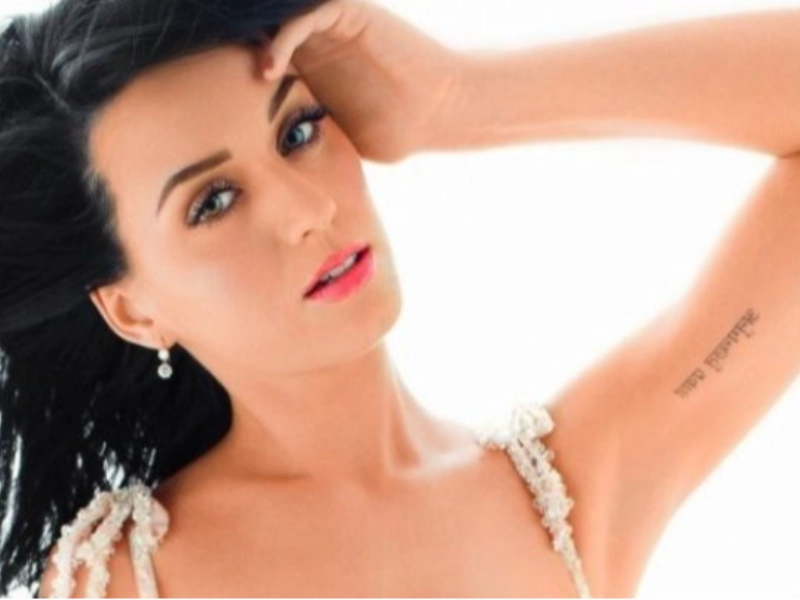 Katy Perry: Playful and Spiritual Tattoos Katy Perry is known for her lively tattoos. She has a Hello Kitty face on her finger, small strawberries and candy on her ankle, and a "Jesus" tattoo that reflects her spiritual beliefs.