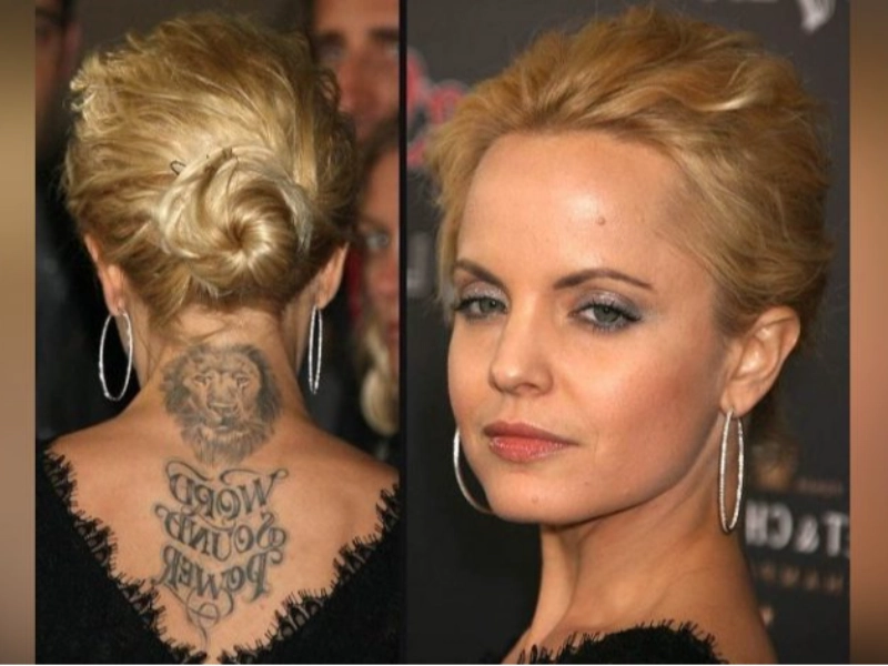 Mena Suvari has a tattoo on her back that says "Word Sound Power" under a lion's head. This tattoo stands for strength, courage, and the importance of words in shaping reality.