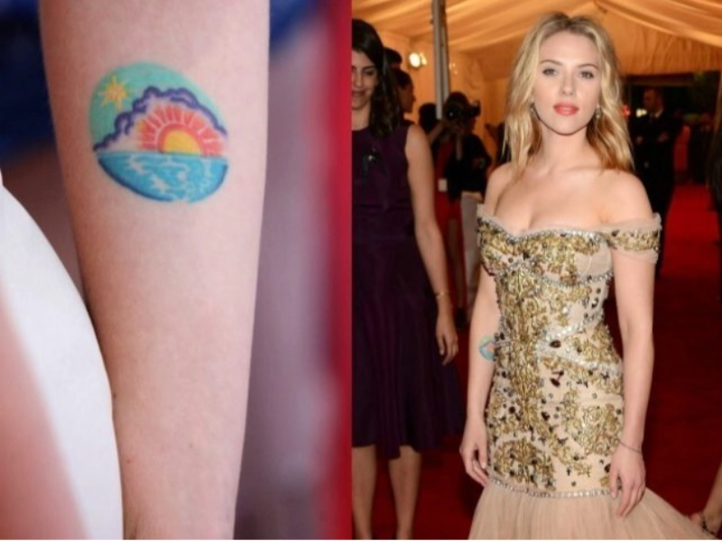Scarlett Johansson: Artistic Body Art Scarlett Johansson is known for her tattoos on her wrists, ankles, ribs, and forearms. A standout is a colorful dawn tattoo on her left hand, symbolizing hope and new beginnings. This design adds energy to her collection and reflects her creative spirit.